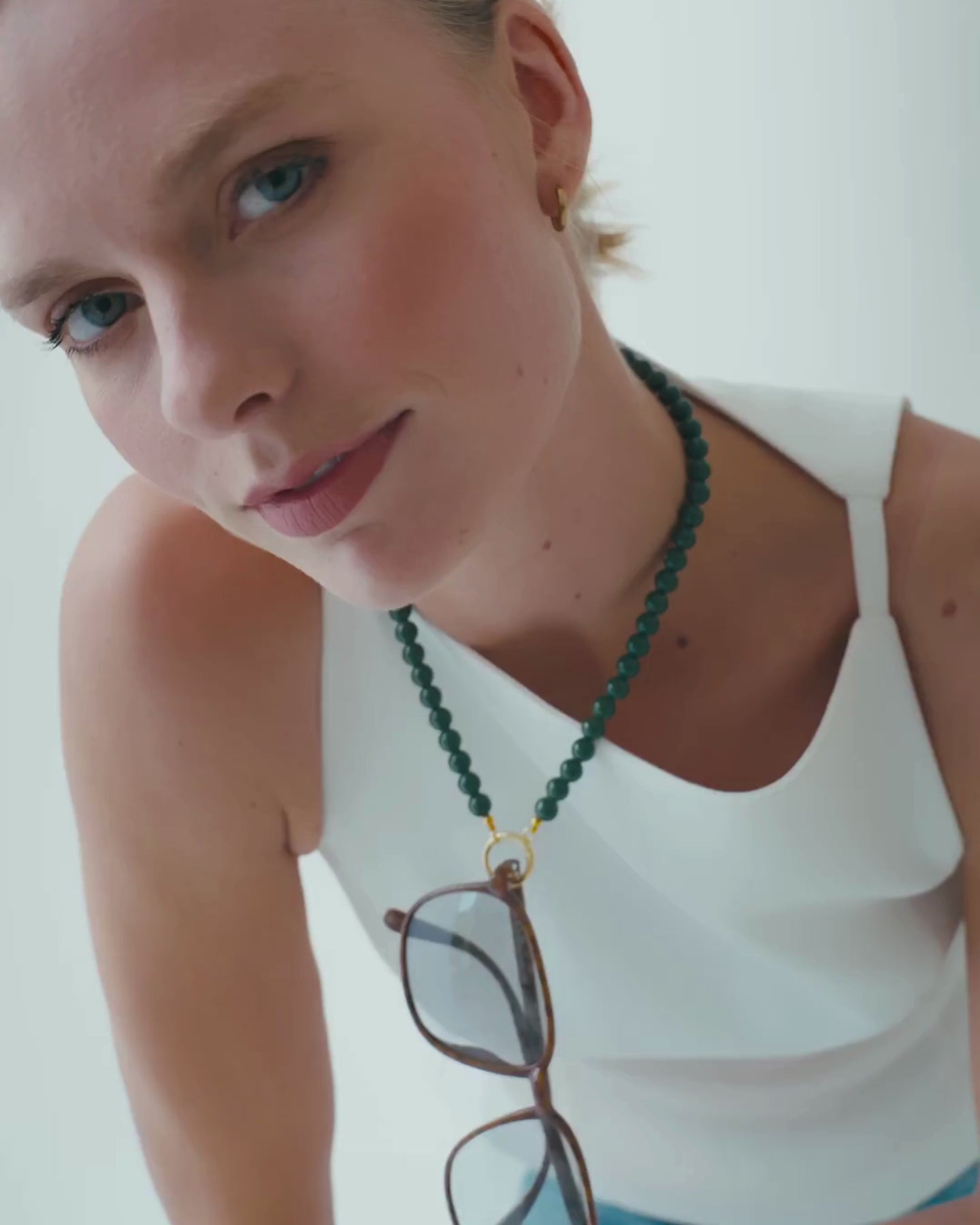 Add a hint of green serenity with the Ceramico Verde Eyewear Necklace. Designed with soft green ceramic beads and a gold-plated ring, it combines functionality with organic charm. The 18 mm ring ensures a perfect fit for nearly all eyewear styles.