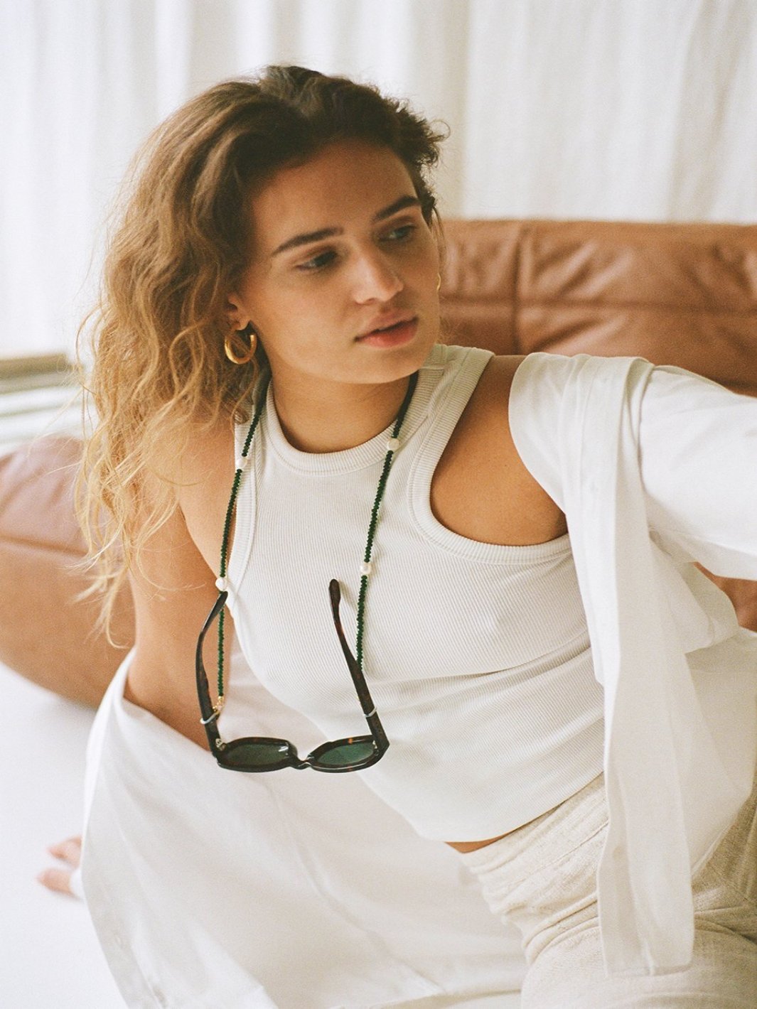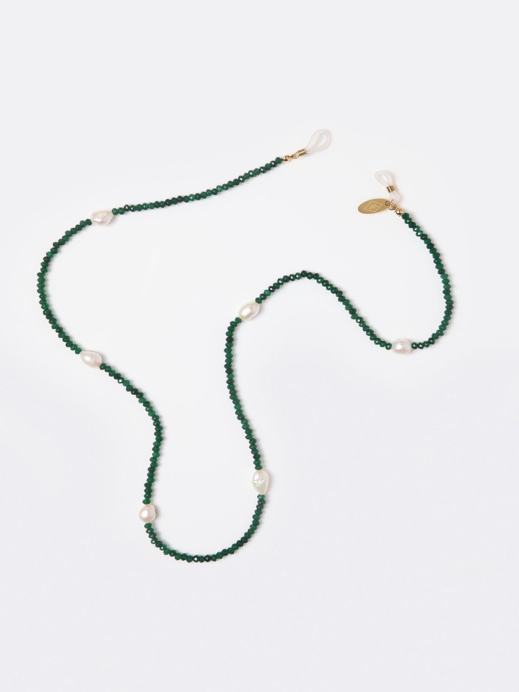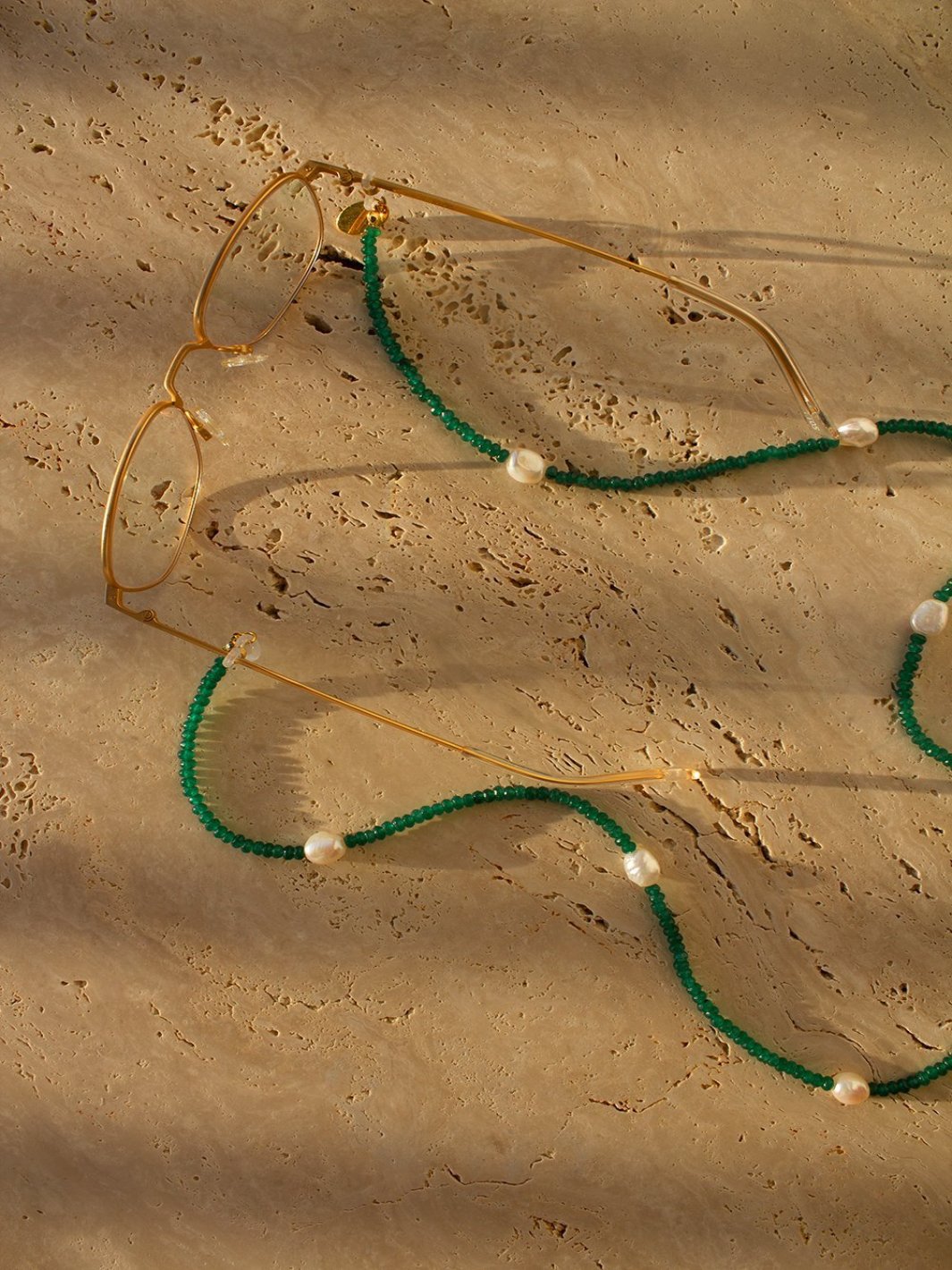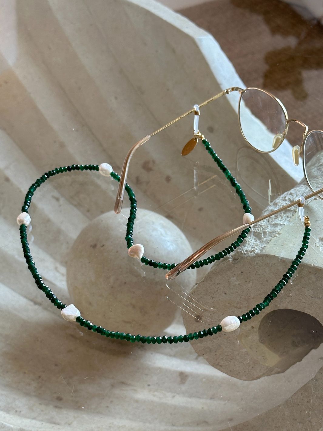 This green glasses holder is an outstander. She's made out of beautiful green stones and big natural pearls. A true beauty to wear on your normal glasses, as well as on your sunglasses. This Sunnycord is a timeless design!