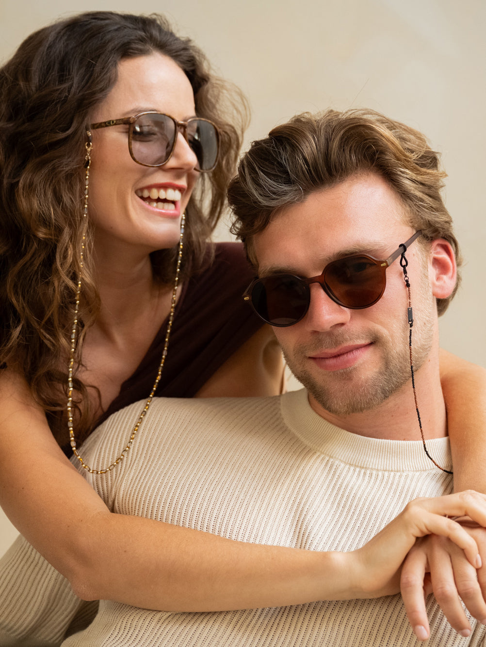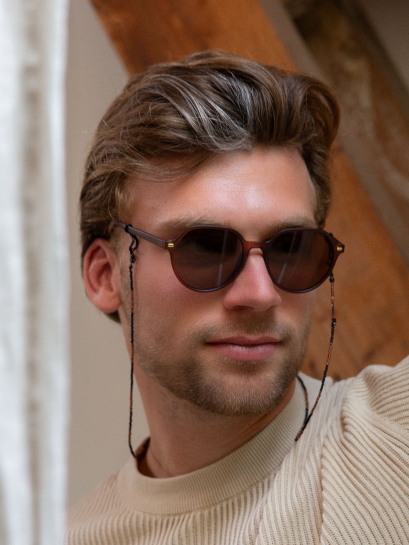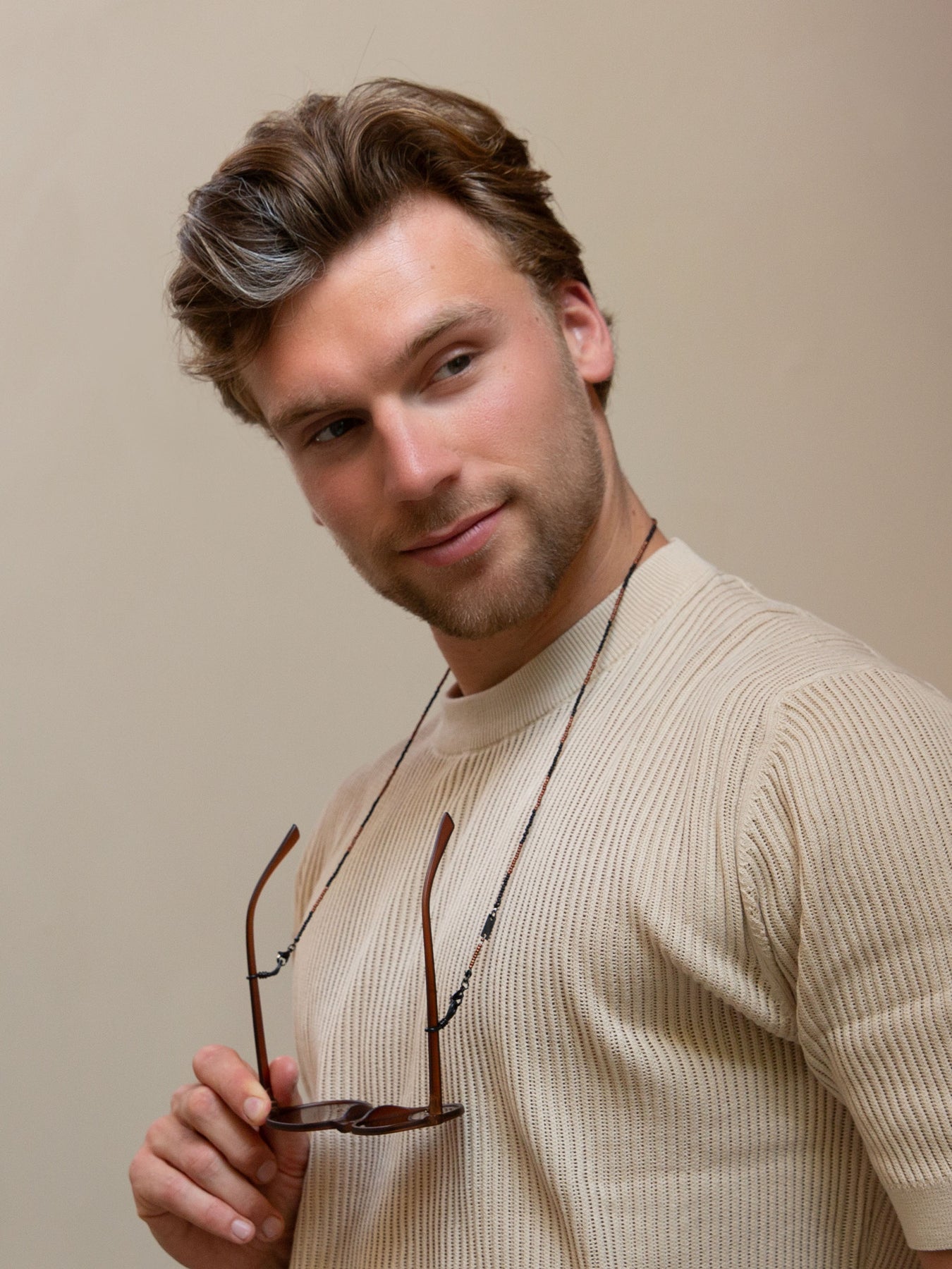 This glasses chain Levi is a finely laced chain and appears very elegant around the neck. The sunglass chain alternates between black and rusty brown colors. When using these colors, we have been inspired by the beige colored linen trend creating is the perfect match with your outfit. The glass chain is usable for any kind of glasses such as for reading and sunglasses. It is perfect for anyone who likes to keep their glasses near without risking to lose them.