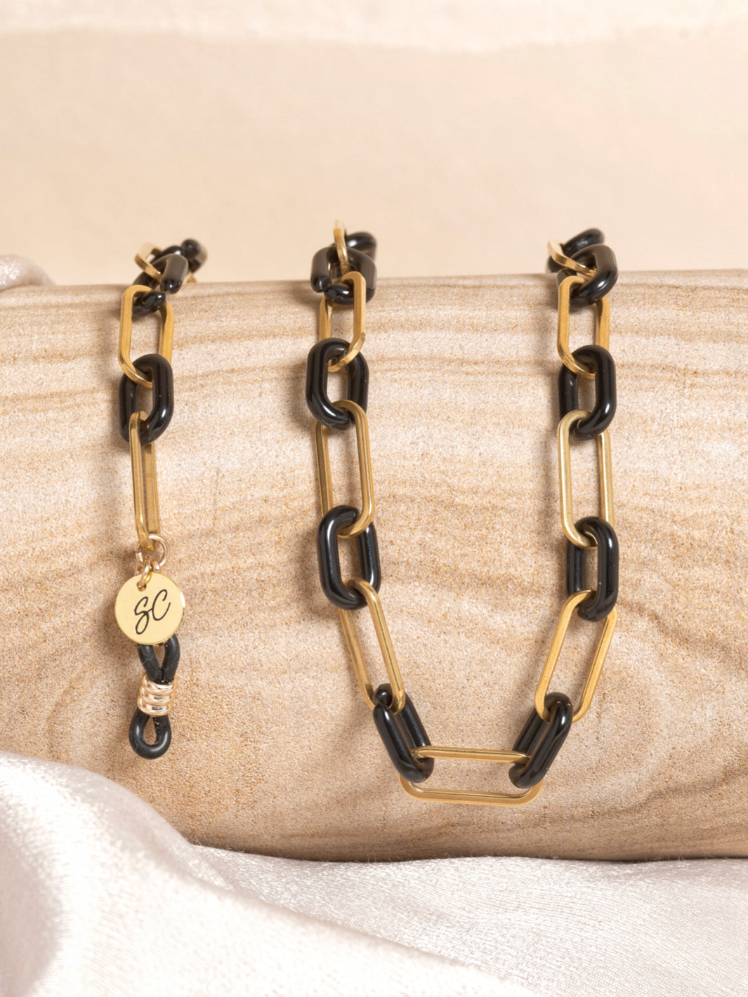 This unique sunglass chain is classy because of the gold and black alternating links. This design derived from her twin sister Mollie. Wear Louis for the extra touch to your outfit and have your favourite glasses always at hand.