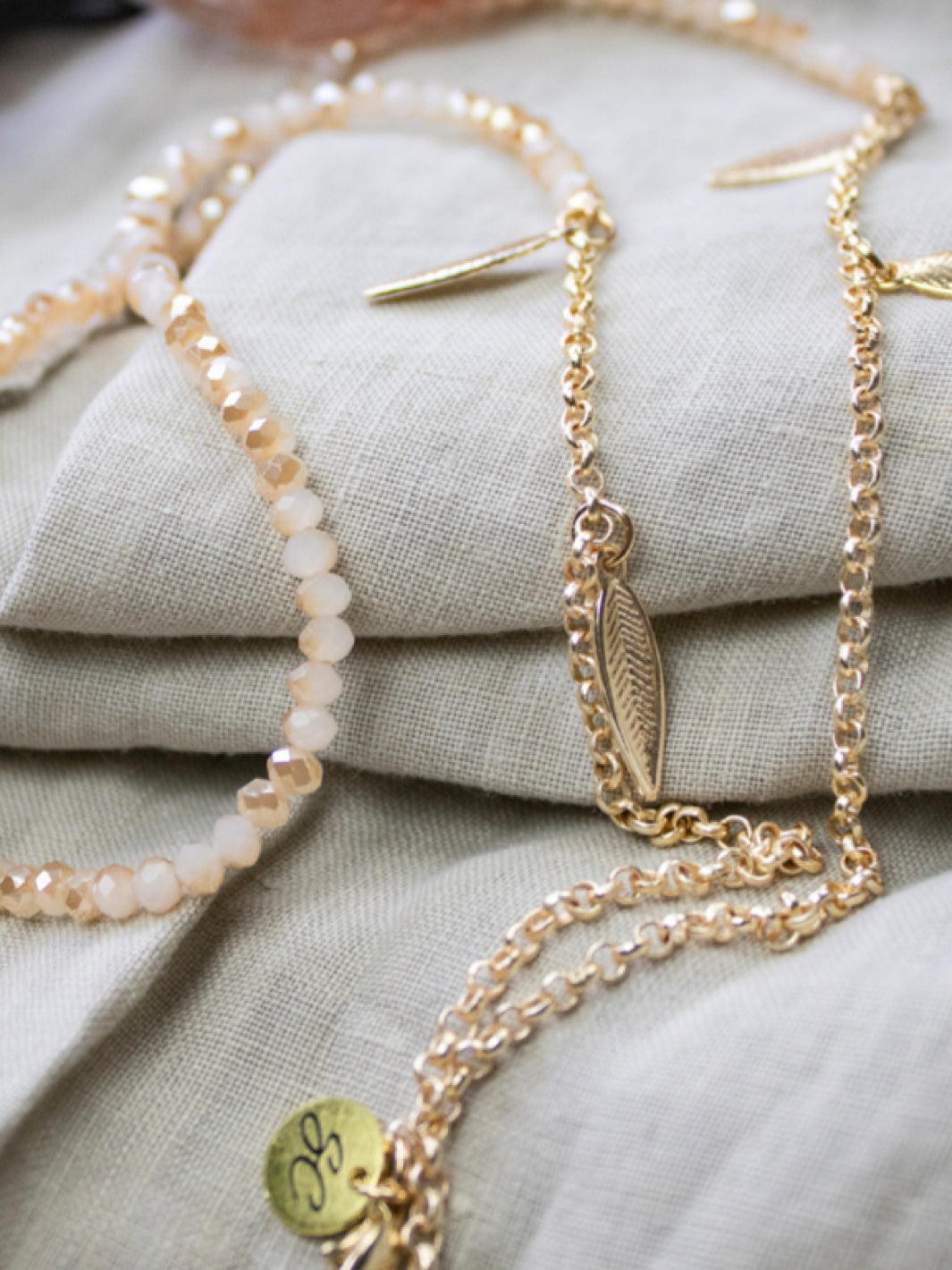 This beautiful sunglass cord barely needs a description. Featuring effortlessly feminine handmade crystal beads that come in either hues of dainty mixed blue or sweet peachy pink, this glasses cord is a statement of airy femininity. Wear it to dress up any outfit.