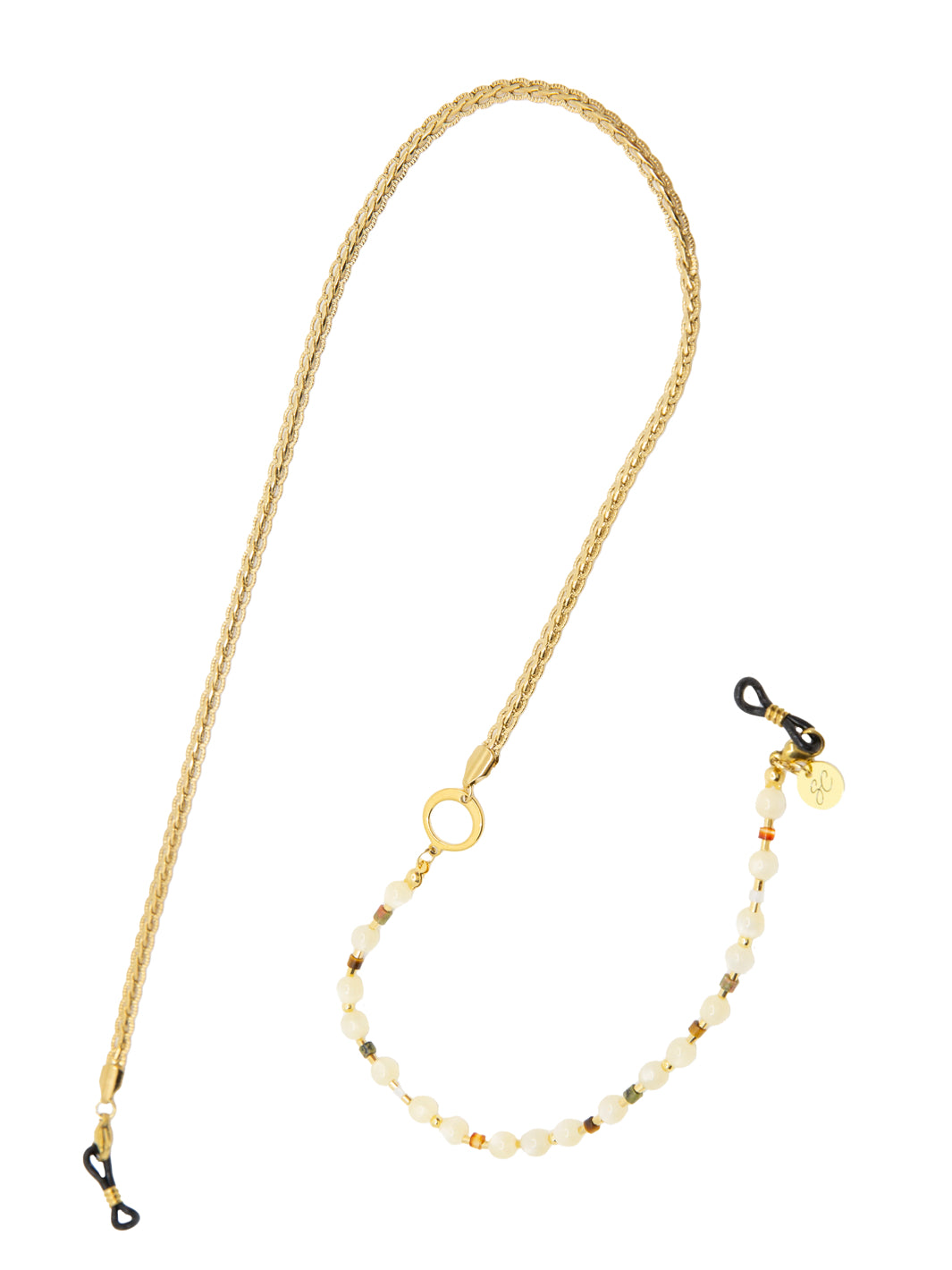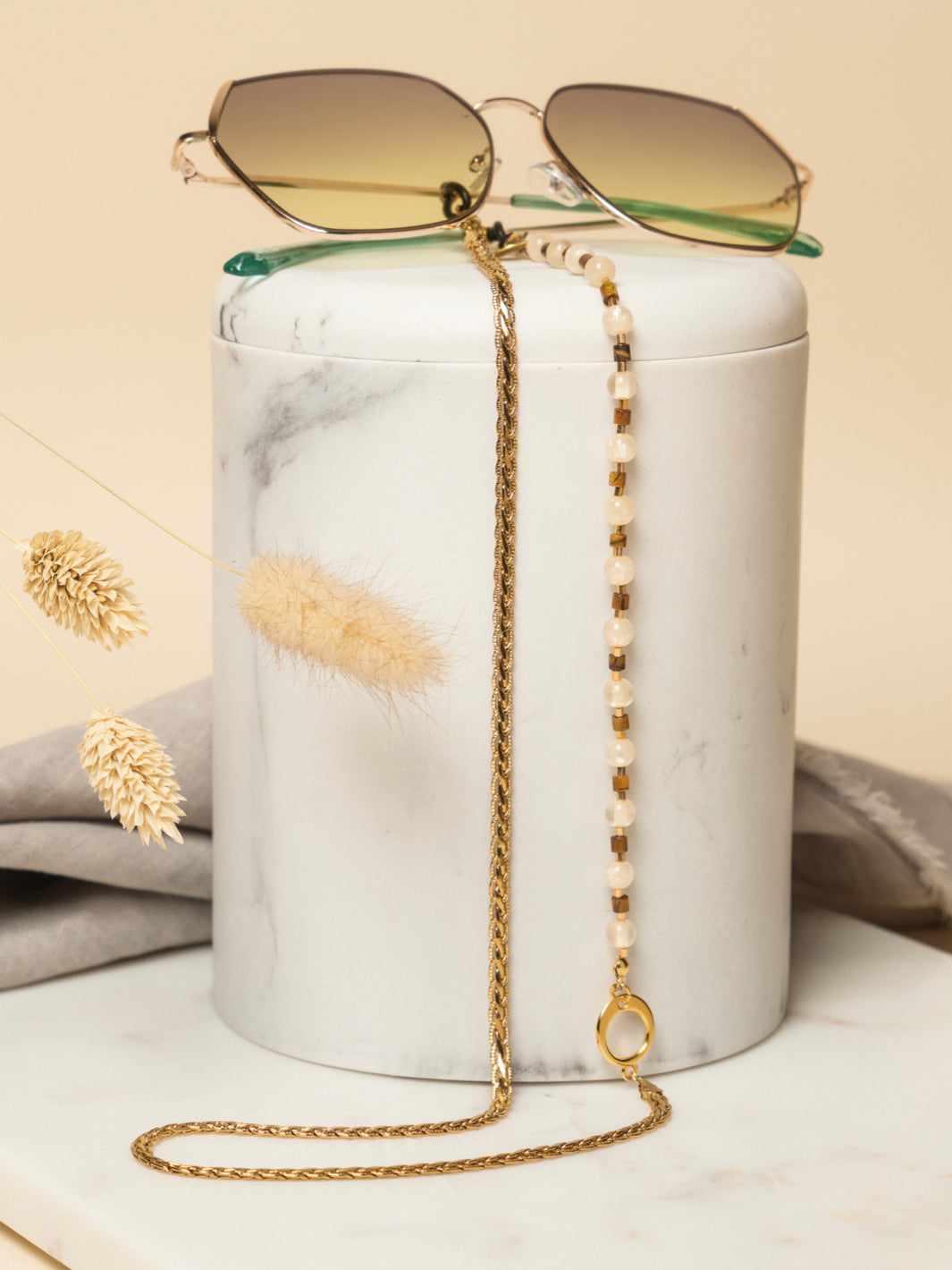 Take a step into the magical world of Maeve, a sparkling sunglass chain made using luxe super Polaris beads and pearls in combination with a braided golden chain. Maeve means ‘magical’ and that is exactly the vibe this sunglass chain radiates. The sparkling and elegant design has been combined with a variating color pallet of luxurious beads, providing this piece of jewelry having with a unique and stylish appearance. Will you go for the multi color variant or is your favorite the one with beads in natural beige color?