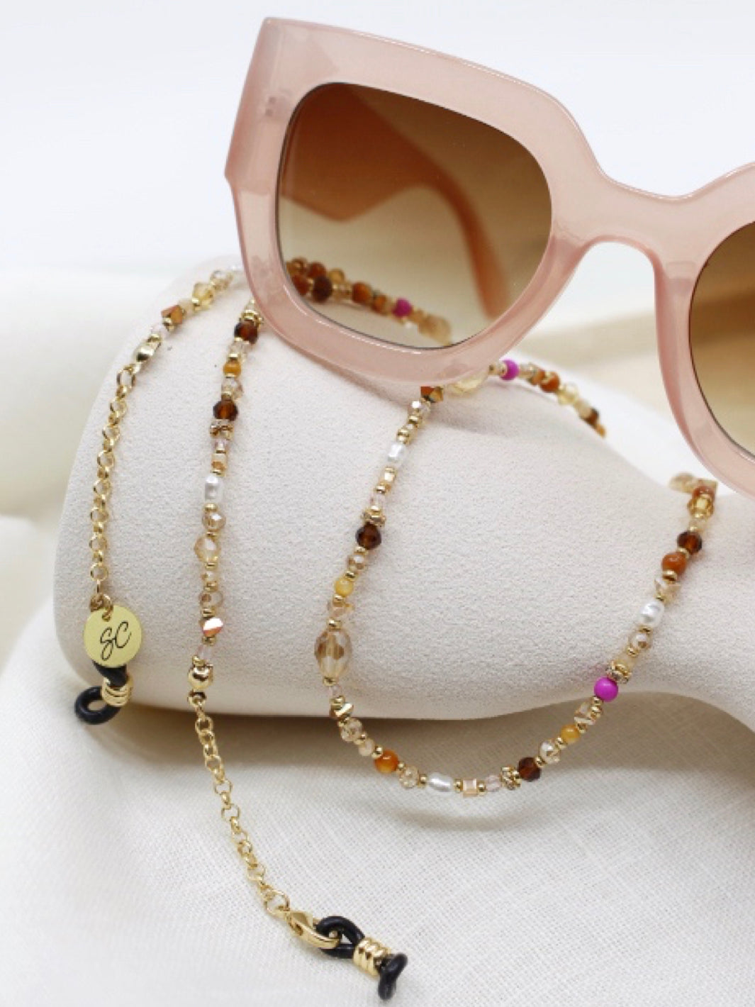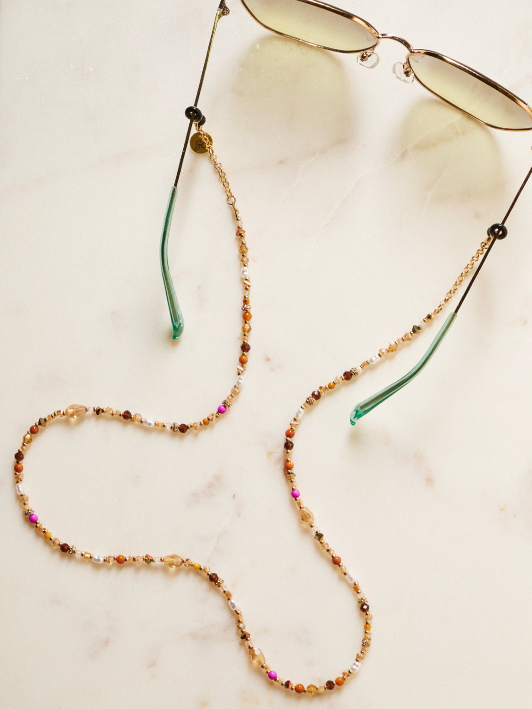 The Stella is our colourful glasses chain that has been defined by a small string of golden chain on both ends. This Sunny Cord has been designed using different types of colourful beads and stones, alternated by a subtle golden pearl. We are such a fan of this design that we designed it in two different colours. Are you opting for the brown one with a touch of pink? Or do the turquoise colours suit better on your (sun)glasses?