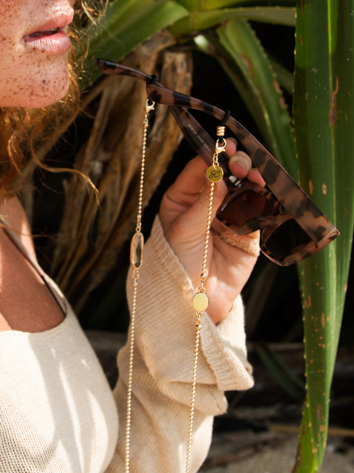 This alluring gold or silver sunglasses chain is the ultimate in versatility, style and beauty… Featuring a bold baguette-shaped crystal stone and a circle charm that come in a variety of shades. This sunglass cord is sure to add flavour and sophistication to even the simplest of outfits. Are you more of a silver girl? Check out silver variants here!