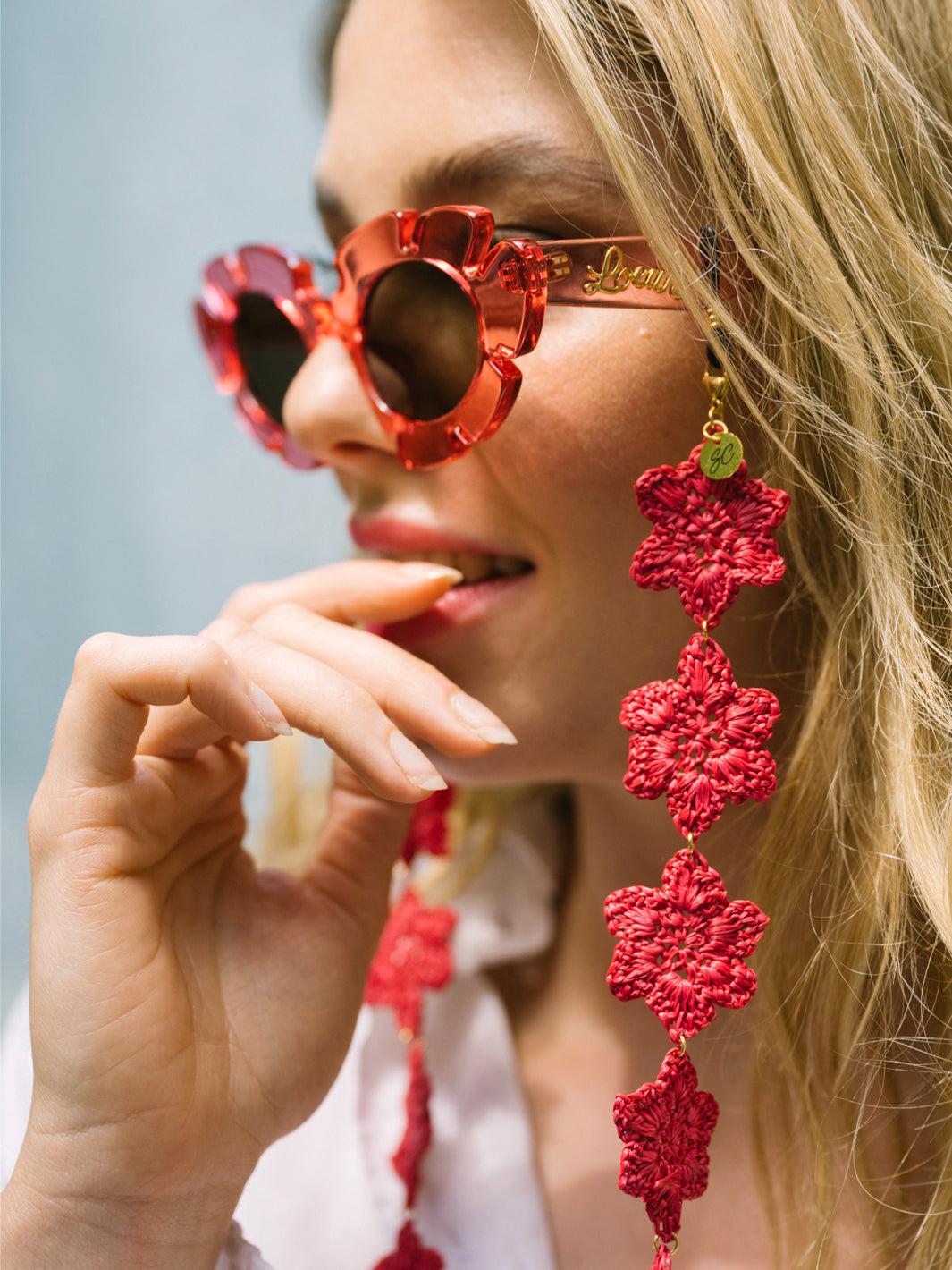 Discover the Lolita, floral-colored sunglasses strap consisting of handmade braided flowers, being the perfect accessory to pimp your glasses and steal the show this summer! These Sunny Cords are available in three stunning colors: raspberry pink, blue and cream beige.