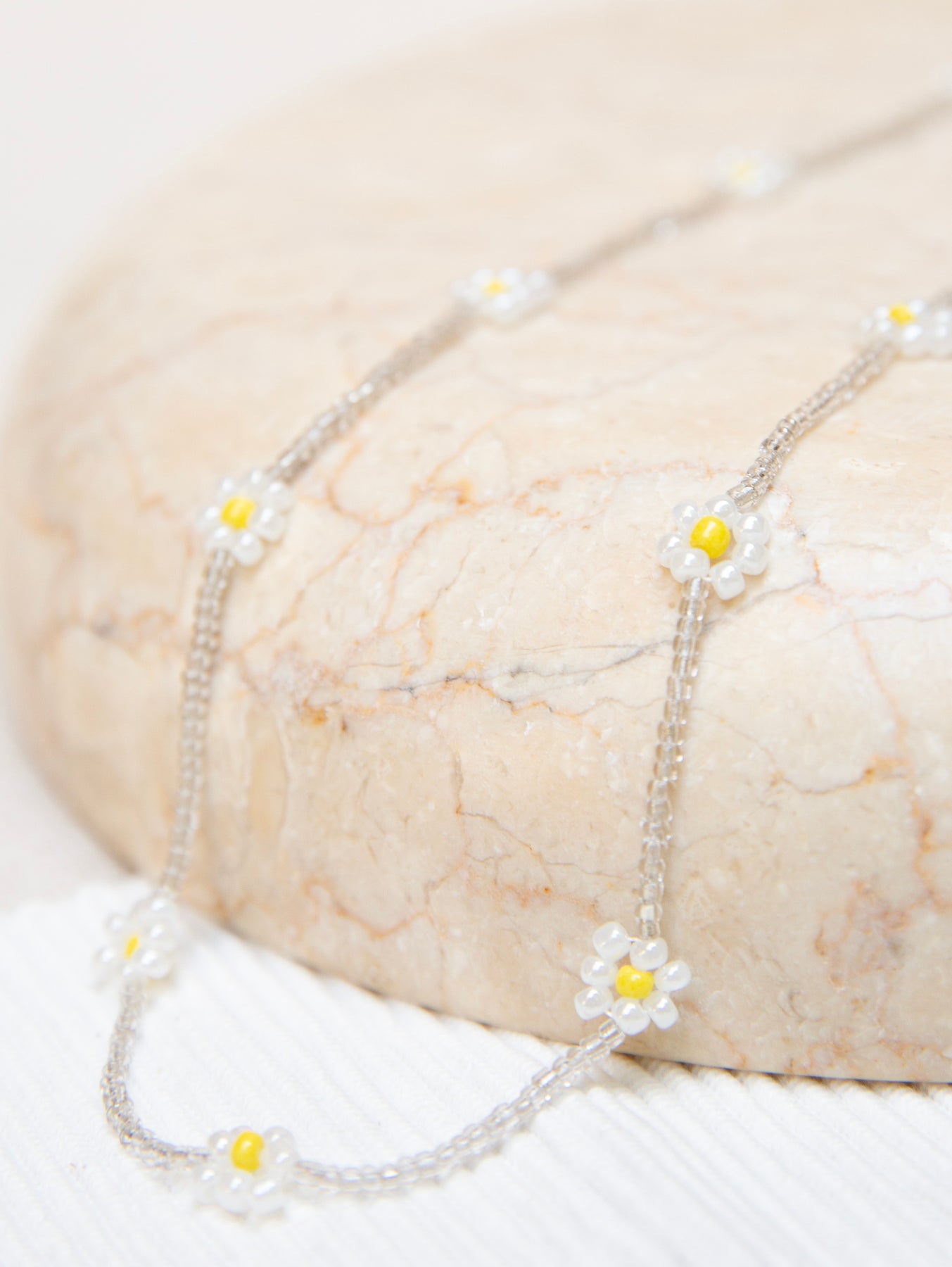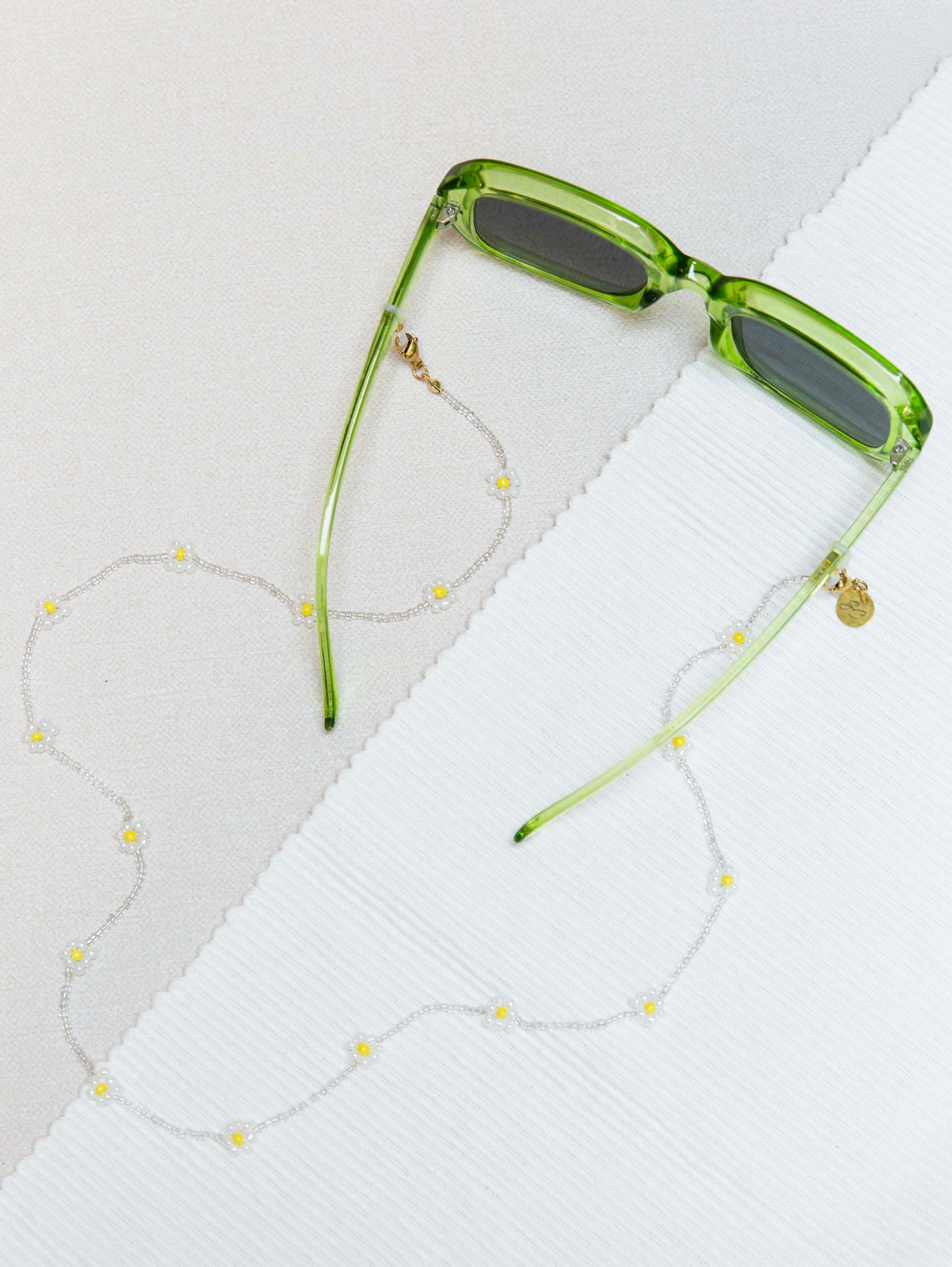 Introducing the Nola sunglasses cord, a unique blend of style and functionality. This beautiful cord is made from glass beads, alternating with cheerful white with yellow flower beads. Perfect for sunny days, preventing your sunglasses from falling off. Complete your look with our Nola eyeglass cord and add a playful flair to your style.
