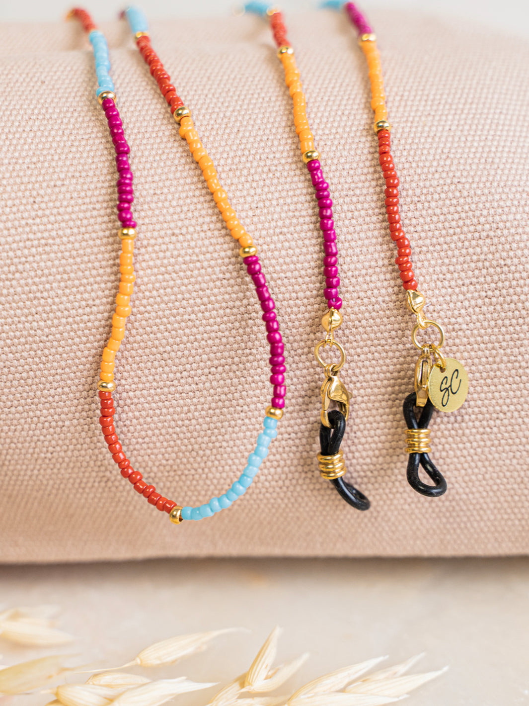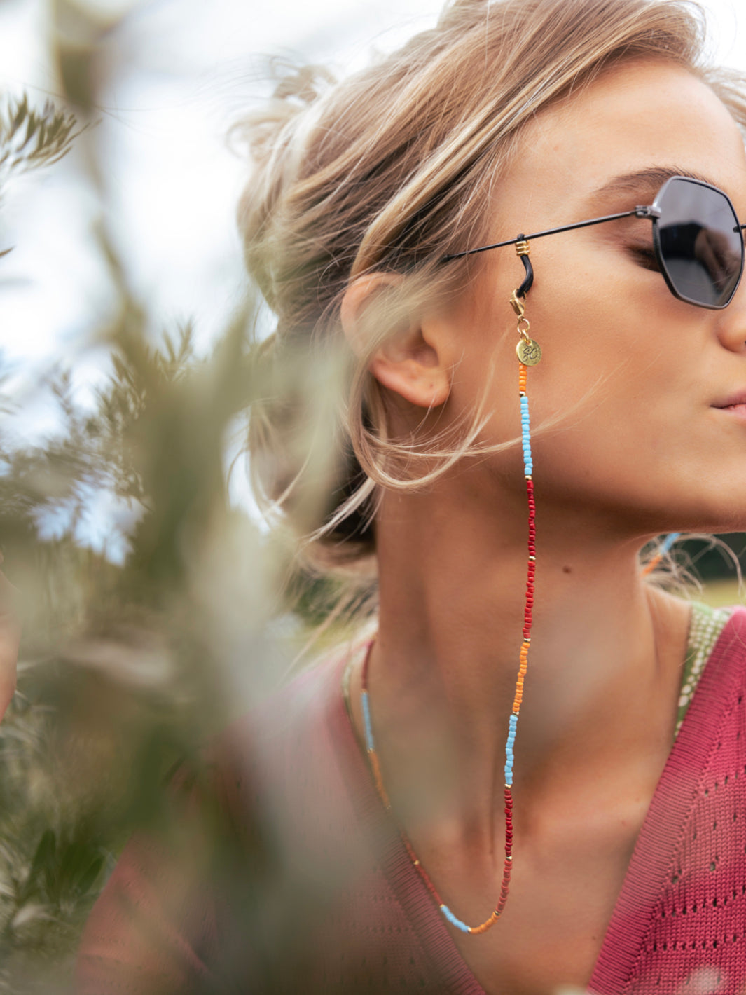 Brighten up your day with sunglasses cord Pippa Colour! This cheerful eyeglass cord is made of beads in vibrant colors like magenta and ocean blue. Prefer a layered look? Check out double cord Pippa!