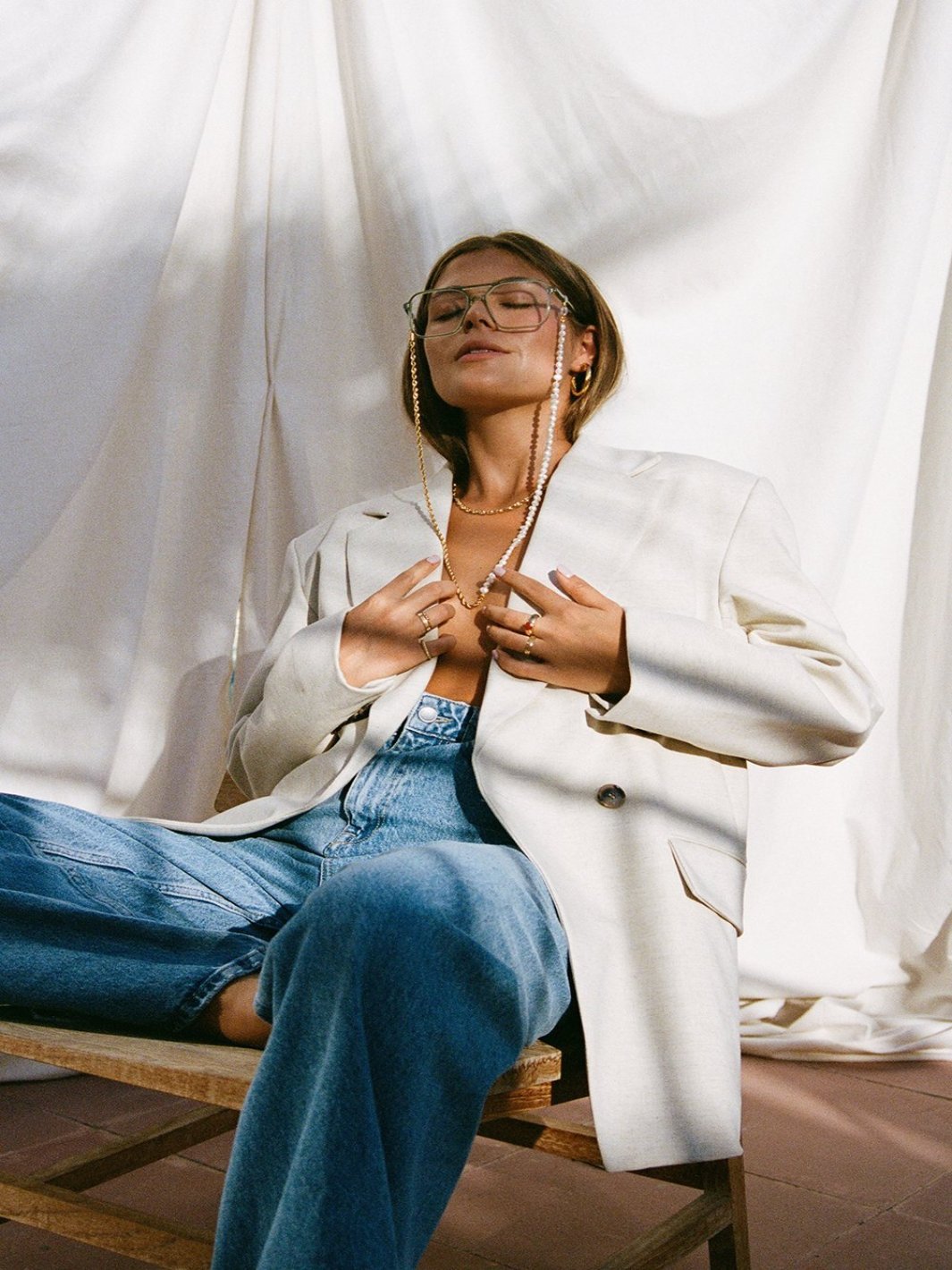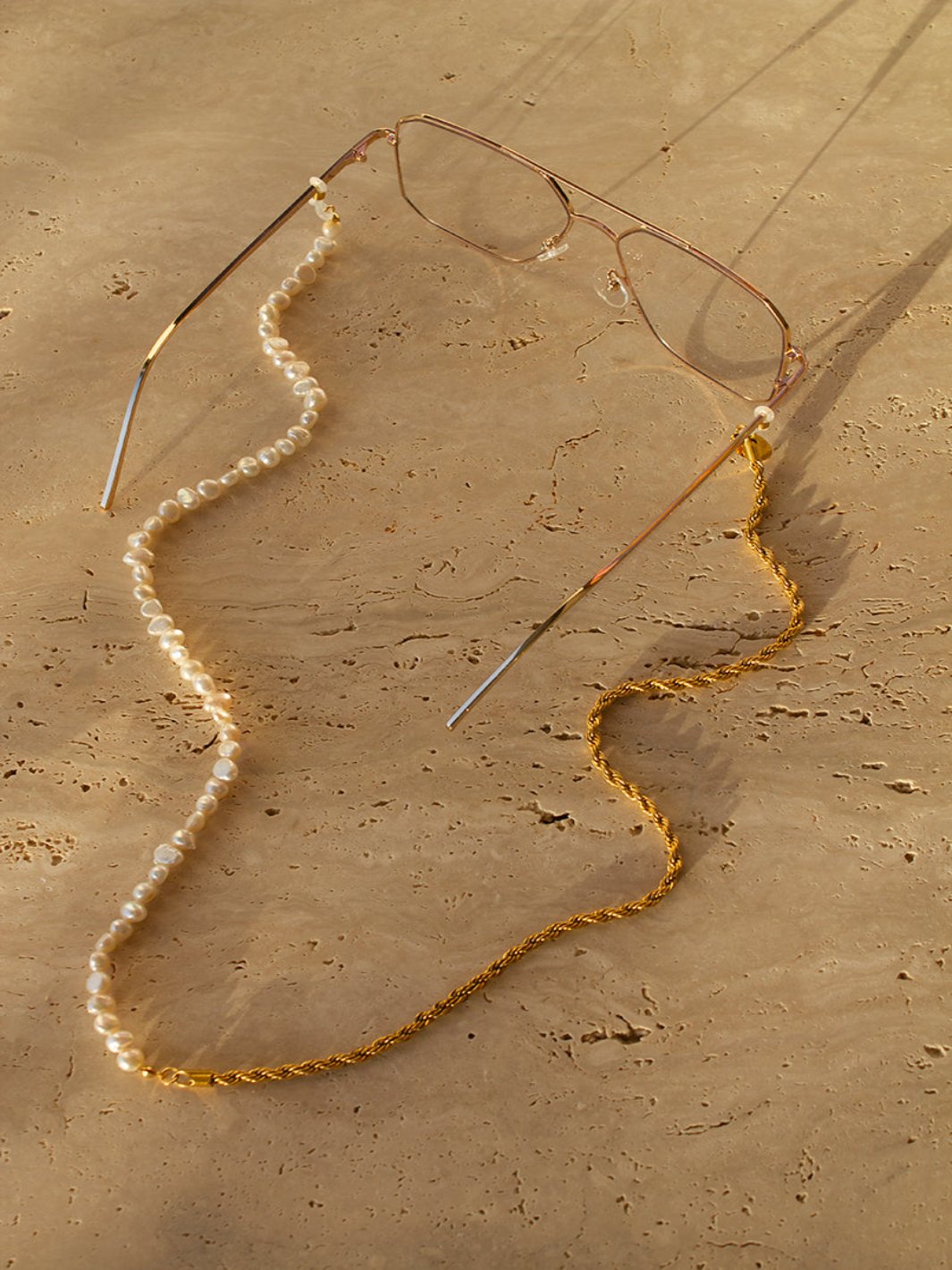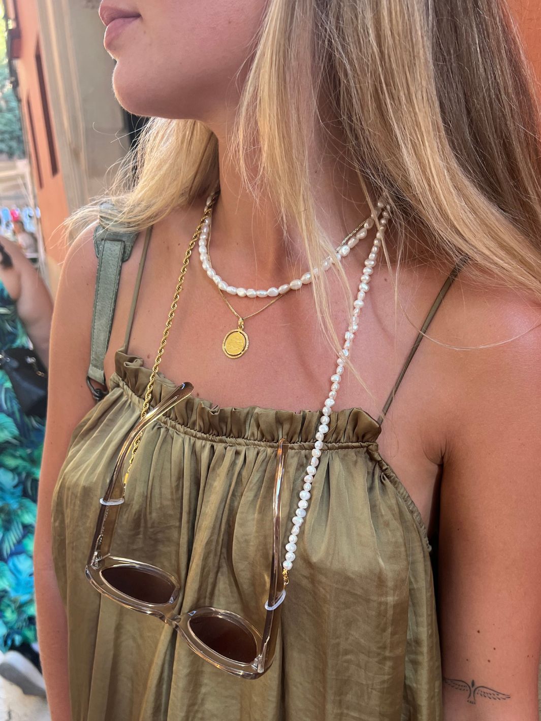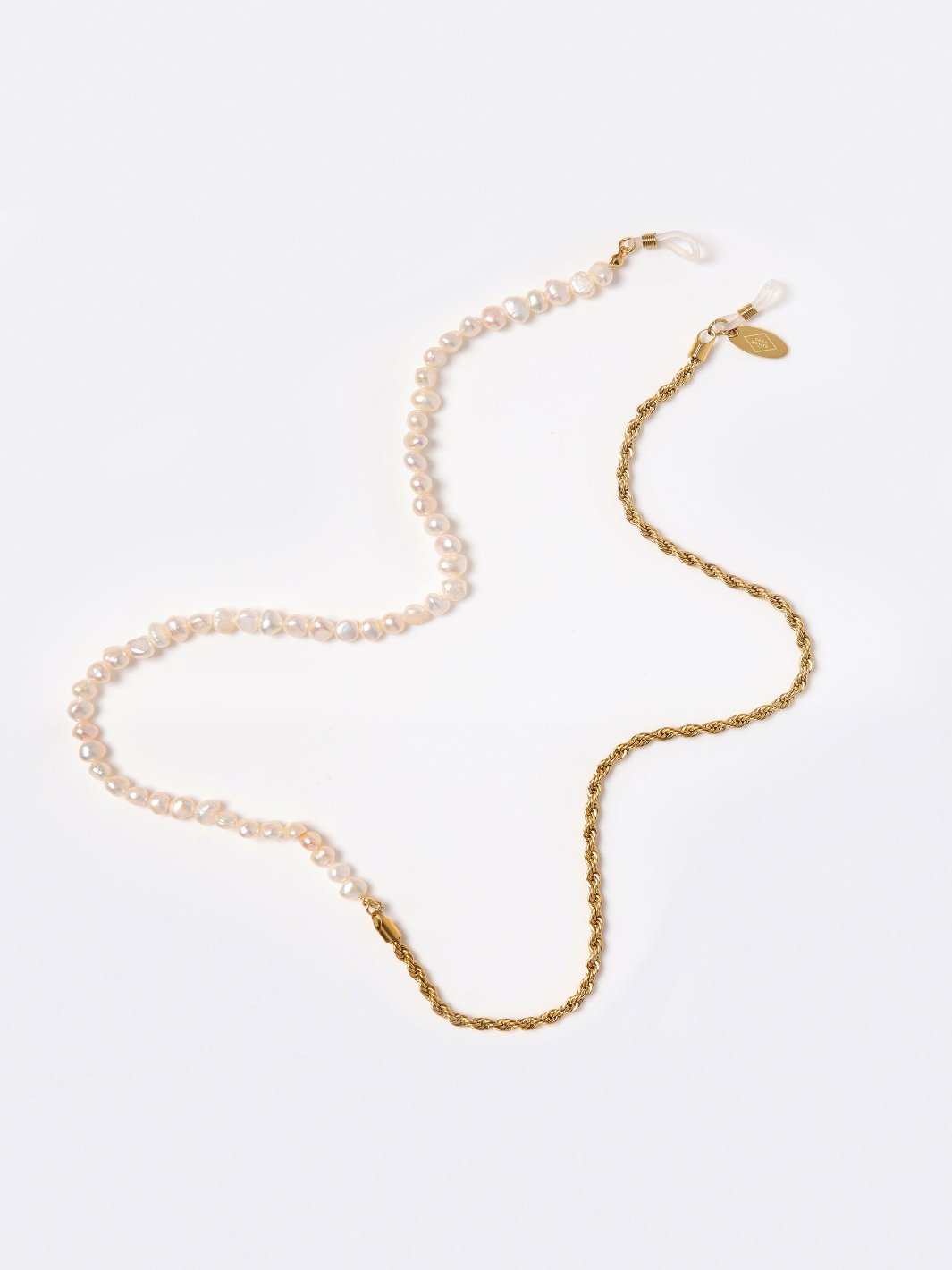 The Two Faced chain is named after her a-symmetric design. This special glasses cord has two different sides, made out of a gold chain and baroque pearls. This two different sides gives the sunny cord such an edgy effect. Dare to wear it and stand out!